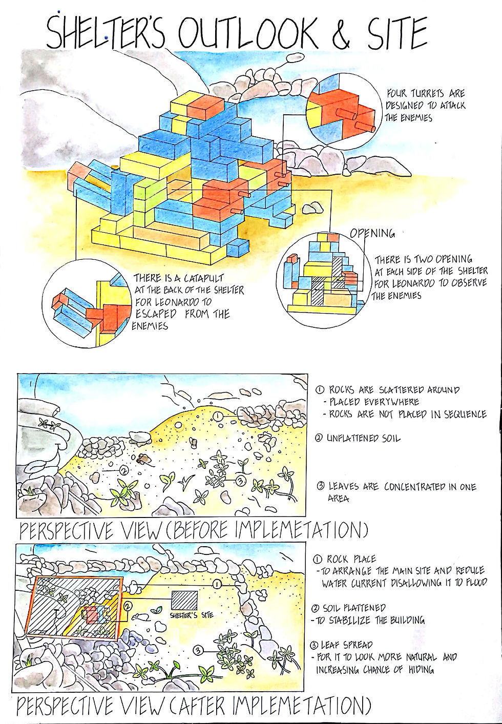 I am required to extend my knowledge through research and to choose 1(one) or a combination of 2(two) of the earth components which are atmosphere on(air/expose to air), hydrosphere(on water or underwater), geosphere(on land/ground) and biosphere(specific to flora setting example: tree). From the chosen natural setting above, we need to find a main suitable site, (approx. 2500mm x 2500mm size) and within the chosen main site, you need to select a shelter site (approx. 500-1000mm x 500-1000mm). The miniature shelter shall be in the shelter site. I am required to do a site study including site survey, site inventory and site analysis upon the selected site. At the same time, each group will be assigned to an animal lego character and concurrently while conducting the site selection and study, each group need to study and consider the needs/essentials of the character in terms of its nature and adaptation. Explanation and justification are required upon interrelation of character and selection site. Ours assigned character is "LEONARDO". We are required to establish a miniature shelter for the assigned character (through the selected site and understanding of assigned character) using a set of blocks. The shelter could be smaller but not bigger than 600x600x600mm size. Throughout this task, we are to record the consideration process for choosing the site and the assembly/placement of the shelter, to record the condition of the site before doing anything to the site and the condition after. Lastly, we are to present all findings according to task above verbally through presentation boards to explain about the condition of environment through the site study (site survey, inventory and investigation) that we have completed, the miniature shelter process with how it relate to the assigned character, the damage/complementary to the natural setting at your chosen site